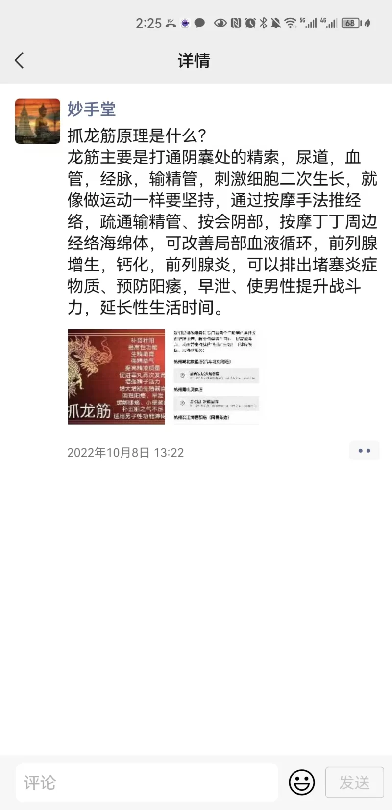 地点就在公司附近,夜里下班了去的,技师就一个,30岁上下,颜值一般,身材还不错。之前听说过抓龙筋,第一次体验,妹子手法力道轻重拿捏很到位,各种按,拍,扯,捏,但是就是不会碰到蛋蛋哈哈,做完感觉下面疏通了很多,本来想让打出来的,技师说当场释放了影响疗效,想想还是算了。这两天早上醒来晨勃比较明显,硬邦邦的,看来这抓龙筋还是有点东西的。欧美金融城附近的哥们可以去体验一下。
