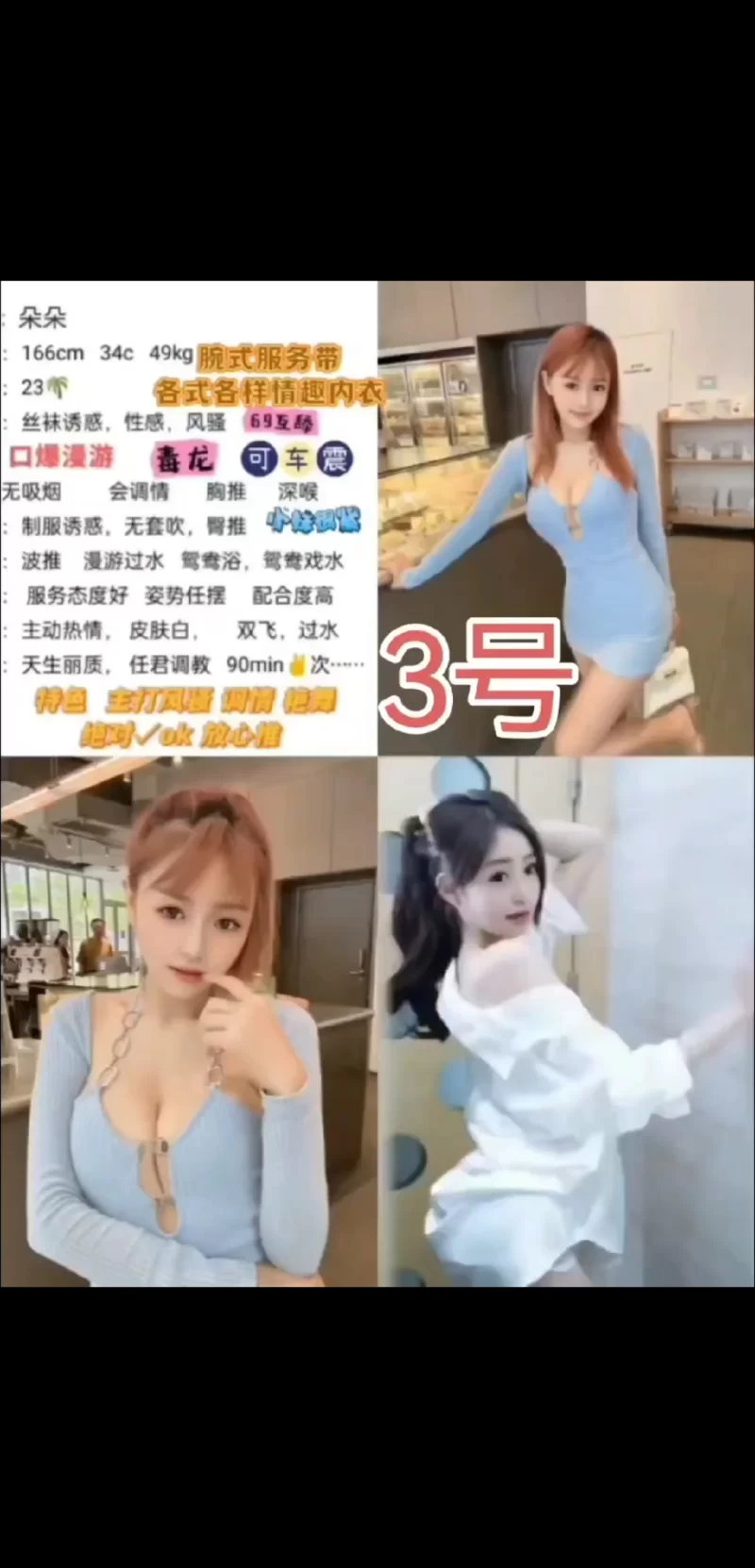 豪华情景套房,服务项目一应俱全,只有你想不到,老师尽心尽力为您服务,让您全身心放松,为您卸下生活工作的压力,享受皇室般的生活乐趣 找妹妹,妹妹会让各位大哥乘兴而来,尽兴而归! 服务项目表: 1:宝贝诱惑 2:鸳鸯戏水 3:泡沫风情 4:游龙戏凤 5:臀动巅峰 6:情意绵绵 7:劲爆KS 8:玉手金蝉 9:十指弹琴 10:水漫金山 11:环游世界 12:品味人生 13:销魂菊花岛 14:飘飘欲仙 15:仙人指路 16:百变佳丽 17:千娇百媚 18:春色撩人诱惑 19:野猫之恋 20:君临天下 21:王者至尊 22:引蛇出洞 23:360度旋转 24:2B站共鸣 25:泰式按摩 莞式一条龙服务/水磨陪浴,口交,深喉,爆玉,制服,丝袜,胸推,毛腿,腿推,过水,漫游,吸皮,水床,毒龙,舔蛋蛋=90分钟爱爱不限次数,安全第一,诚信经营,绝不忽悠,狼友认证信赖团队。 安全问题,请大家放心,因为各位的安全,也就是我们各位员工的安全